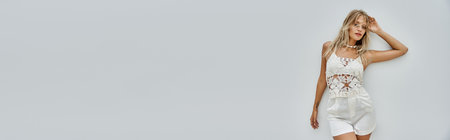 A blonde woman in a stylish white crochet top and shorts poses against a grey backdrop, radiating summer vibes.