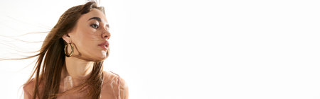 A fashionable young woman with flowing hair exudes confidence and grace in a tranquil scene.
