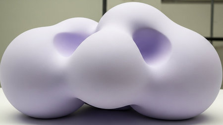 showing soft lavender abstract sculpture with interconnected blob-like forms and indented cavities. resolution