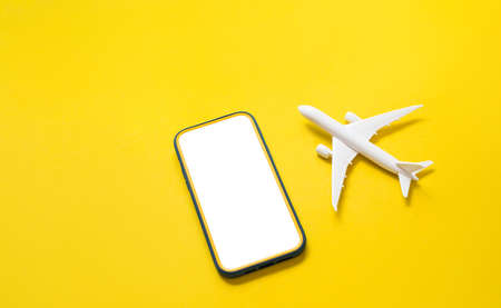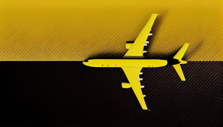 Plane on a yellow-black background. Flat lay with copy space and top view. Travel background for travel agency banner,poster.