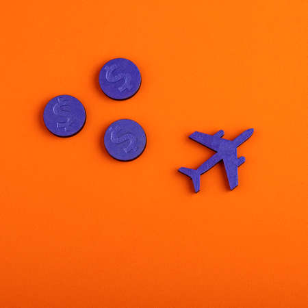 Little grey plastic plane and little nameplate on blue background with copy space. Wooden textured background.
