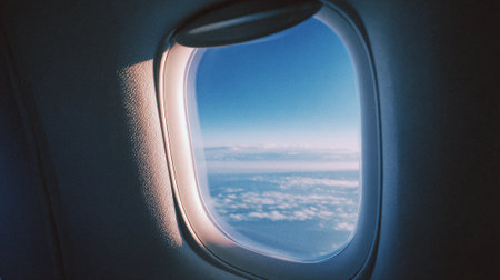 Under a bright blue sky, an individual stretches their hand towards an airplane soaring overhead, surrounded by fluffy white clouds. It captures the spirit of travel and adventure.