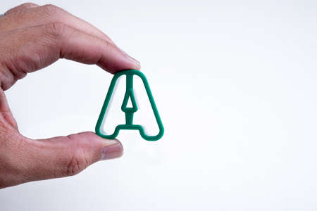 A white mannequin hand holds a mini plane on blue background. Travel, air flight concept