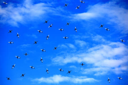 Aircraft condensation contrails in the blue sky inbetween some beautiful clouds