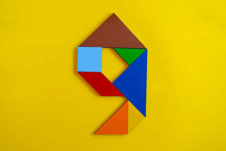 The heart of the wooden elements of the logical puzzle on a yellow background view from above with a copy space. I like to solve logical problems