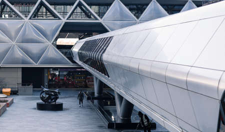 London, UK - February 2, 2021: Cross rail tunnel connecting Canary Wharf office buildings and tube entrance