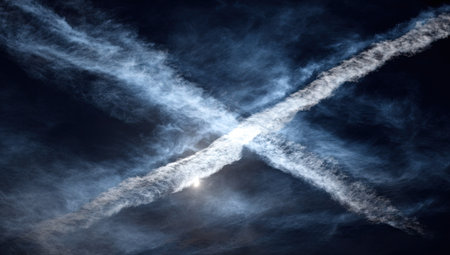 Two contrails create a striking X shape across a predominantly dark blue sky. The vapor trails appear white and luminous, contrasting with the shadowed environment. The composition emphasizes lines and textures, possibly suitable for editorial or artistic uses. The lighting highlights the cloud structures.
