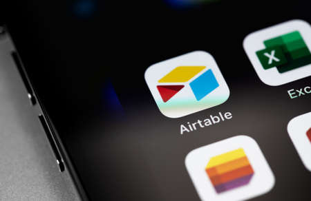 Airtable mobile app on screen smartphone, iPhone. Airtable is a cloud-based service headquartered in San Francisco. Moscow, Russia - February 16, 2021