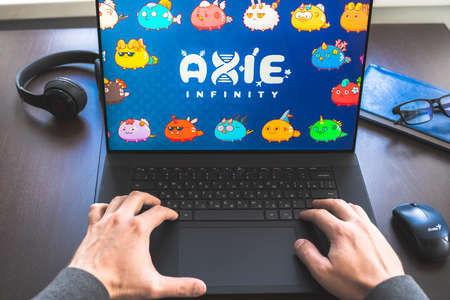 Russia Moscow 30.05.2021.Logo, screenshot of blockchain nft ethereum cryptocurrency game Axie in laptop screen. Man playing, collecting, creating crypto pets, heroes. Earning digital money tokens AXS.