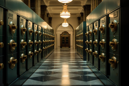 Interior of a hotel corridor with doors and lockers in classic style, lockers in a bank in a vault, AI Generated