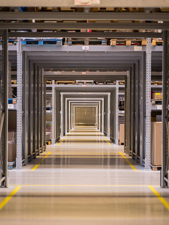A wide warehouse aisle showcases organized pallet racks filled with boxes and packages. The modern industrial space is well-lit, emphasizing efficiency and organization.
