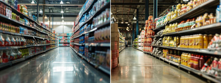 Aisle in a brightly lit supermarket filled with stocked shelves, representing retail shopping, grocery, and consumer goods in a modern setting.