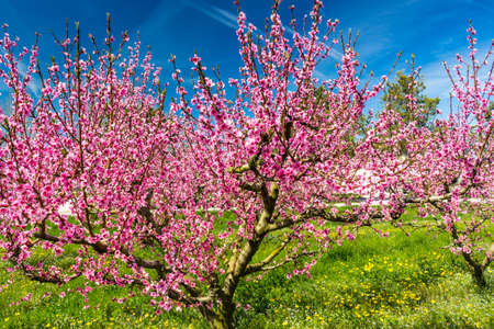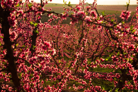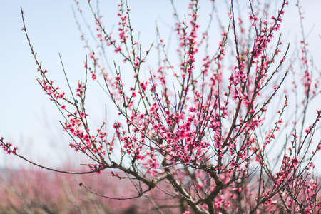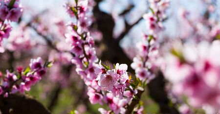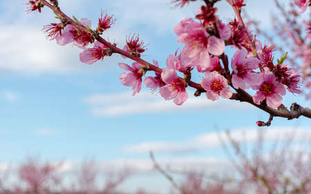 View of field with flowering peach trees at sunny spring day over blue sky. Close-up blossoming. Texture of pink flowers.