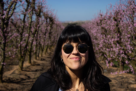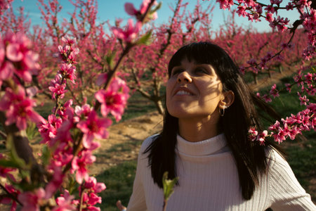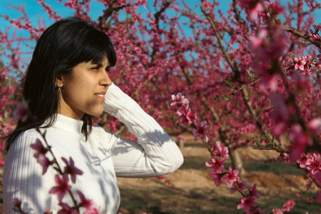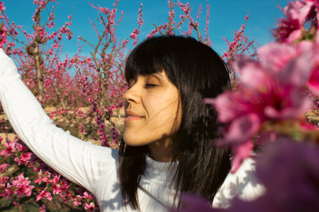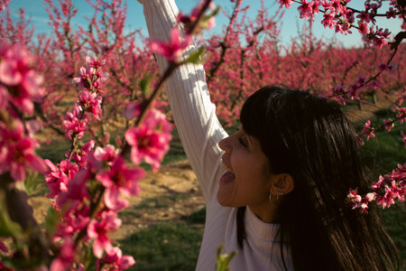 Caucasian woman among the pretty pink peach blossoms, in Lleida, Spain.