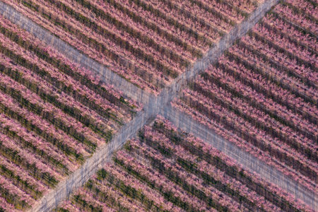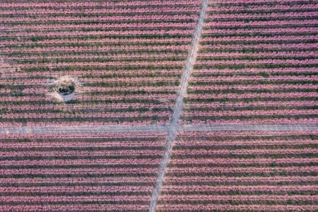 Aerial view the orchard of peach trees in bloomed in spring in the plain of Veria in northern Greece