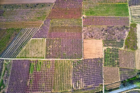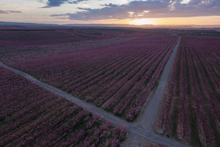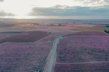 Aerial view of Peach fields in pink flower at spring, in Aitona, Catalonia, Spain