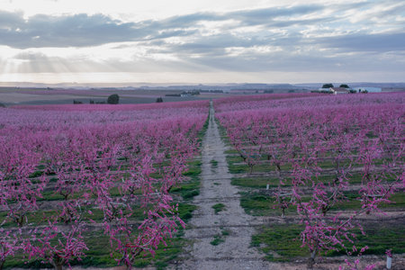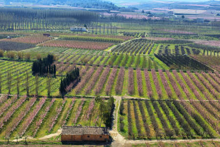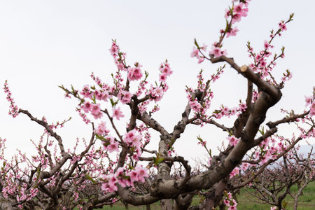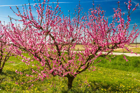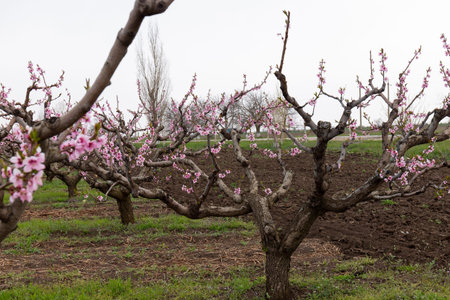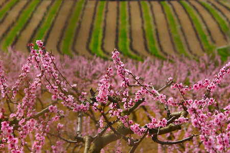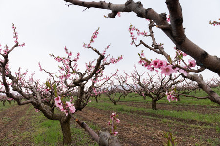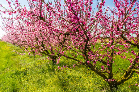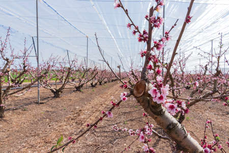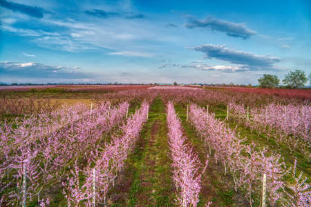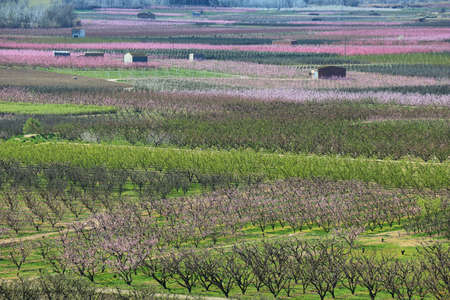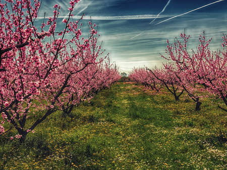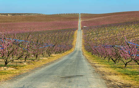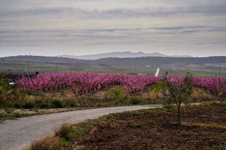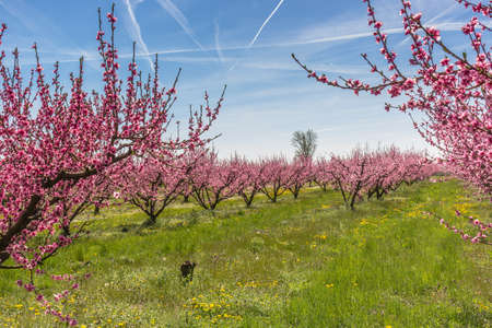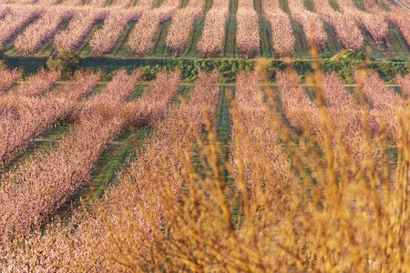 Rows of peach tree blooming in spring day in Lleida (Catalonia, Spain). There are a lot of a blooming fields in Aitona, Alcarras and Torres de Segre.