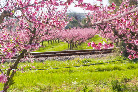 railroad tracks along the arrival of spring in the blossoming of peach blossoms on trees planted in rows: according to traditional agriculture these trees have been treated with wide range fungicides