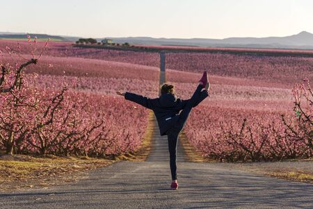 Young girl doing a gymnastic pirouette with the pink sea peaches in bloom as background. Aitona spring landscape.