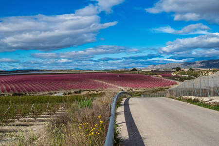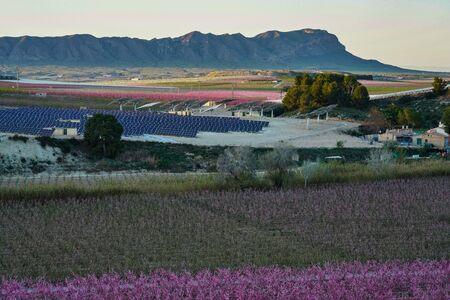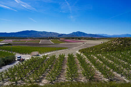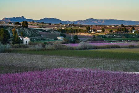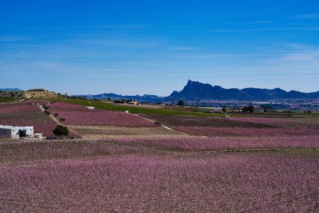 Flowering of the peach tree with the Sierra La Pila in the background in the Region of Murcia. Spain