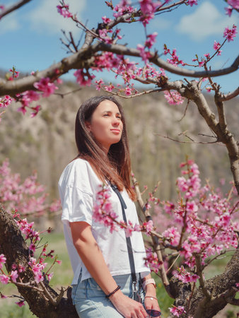beautiful woman with dark hair in white t-shirt among blossoming peach trees in park. Looking at camera. Spring season.