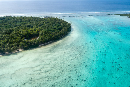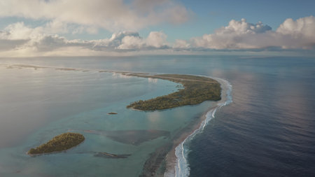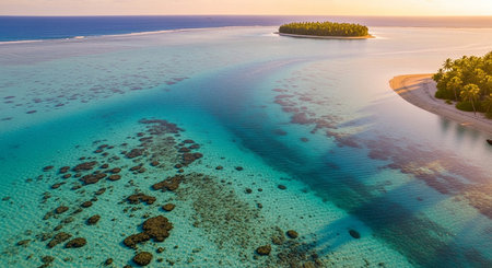 Coral reef barrier in south pacific ocean under sunset sky. High angle shot turquoise atoll lagoon, tropical island with palm trees. Beautiful landscape of untouched nature. Remote wild nature travel