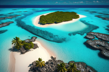 AI Generated. Drone shot of a remote tropical island, featuring turquoise waters, palm-fringed beaches, and coral reefs from above