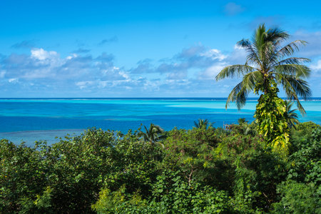 A serene coastal view of the ocean with palm trees on Maupiti Island, showcasing the turquoise waters and lush tropical surroundings in French Polynesia
