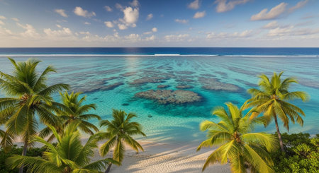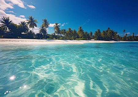 Palm trees. Beach. And crystal-clear shallow water gradually transition into deeper. Turquoise ocean waters. Creating a breathtaking tropical seascape under a bright blue sky dotted with white clouds