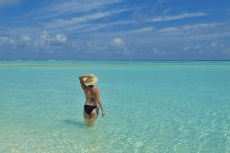 happy young woman on summer vacation on beautiful tropical beach have fun enjoy and relax