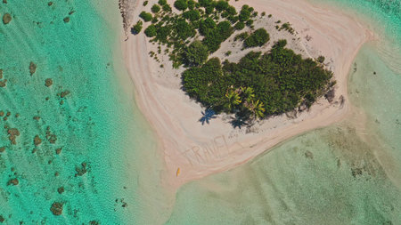 Aerial view top down small tropical island with palm trees and white sand beach surrounded by turquoise ocean water and coral reef. Remote wild nature paradise, exotic summer luxury travel. Drone shot
