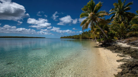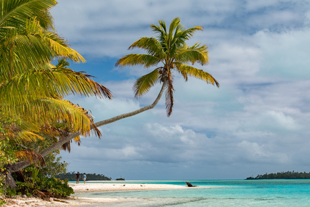 Stunning tropical island with palm trees, white sand, turquoise ocean water and blue sky at Cook Islands, South Pacific