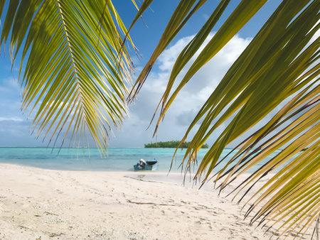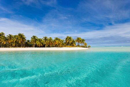 Stunning tropical Aitutaki island with palm trees, white sand, turquoise ocean water and blue sky at Cook Islands, South Pacific. Copy space for text