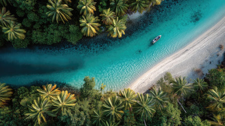 Experience the tranquility of a tropical paradise from above, showcasing vibrant palm trees, azure waters, and a small boat gliding along a sandy shoreline.