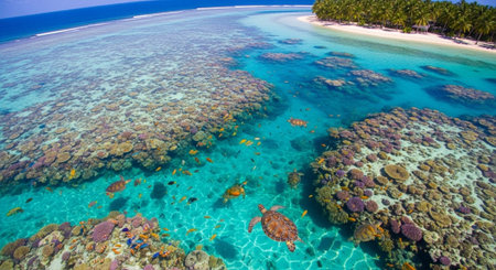 Paradise showing aerial view of a vibrant turquoise coral reef lagoon with clear shallow water revealing intricate patterns and white waves crashing on the outer...