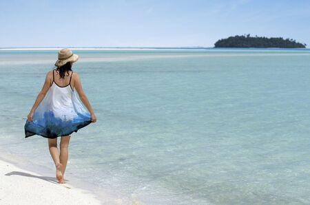 Young woman walks on Aitutaki Lagoon Cook Islands