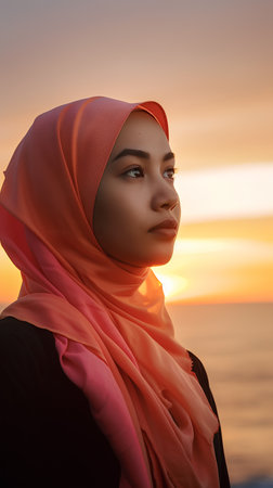 Portrait of beautiful young muslim woman wearing hijab looking at the sunset