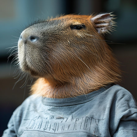 This captivating close-up image features a capybara gazing thoughtfully amid a lush green backdrop, enhanced by beautiful bokeh effects.