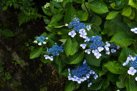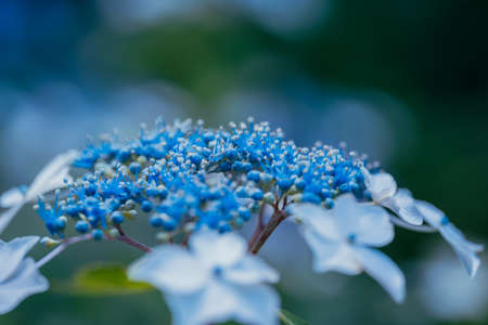 Beautiful blue lacecap hydrangea flowers blooming in early summer
