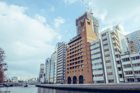 Landscape of Osaka downtown buildings nearby the Osaka Castle at dusk in the evening - Osaka city, Japan.