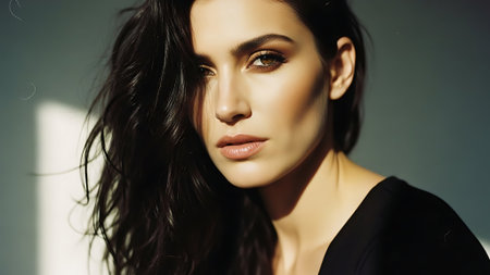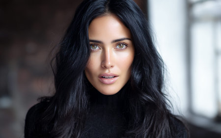 A woman with wavy, long hair stands against a light wall while wearing a black sweater. Her look is elegant and natural, exuding confidence. Soft light highlights her features.