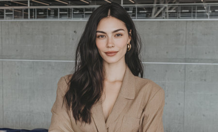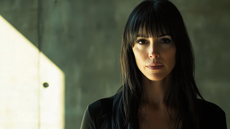 A woman showcases a poised expression in a modern, minimalistic setting. Her long dark hair and bangs frame her face, highlighting her strong features against the concrete backdrop.
