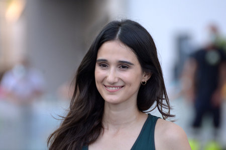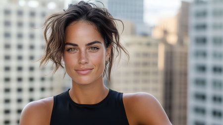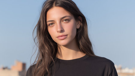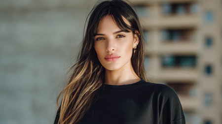 A young woman with long dark hair poses confidently outdoors. She wears a simple black shirt and stands in front of a blurred urban background. The lighting highlights her features beautifully.
