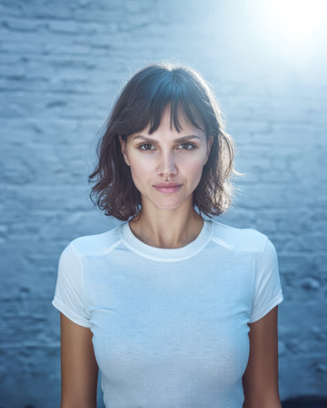 A young woman stands confidently, dressed in a white t-shirt, with her hair styled naturally. She faces the camera with a calm expression.