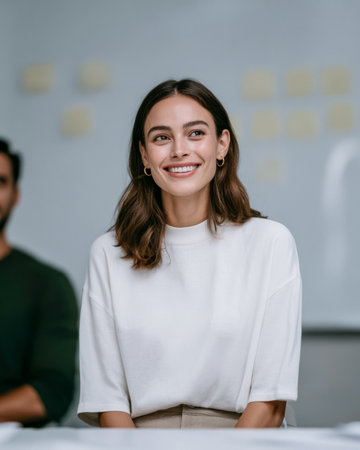 A woman sits at a round table in a bright office. She smiles while listening to others talk. Behind her are two people also engaged in the discussion. Notes are on the wall.