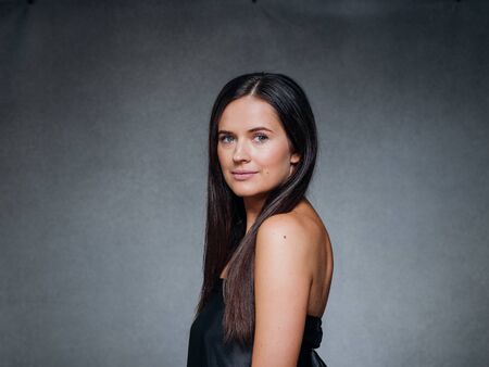 Beautiful female owner of the company, look at the camera, smiling. Gorgeous business lady posing at black background, showing success. Adorable pretty woman wearing luxury fashion dress