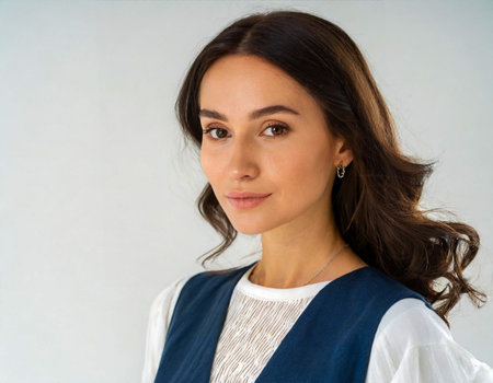 Smiling woman with medium-length black hair, wearing a stylish white blouse and blue jeans, posing confidently in a professional photo studio. Bright white background with soft lighting, blurred backdrop for a modern look.
