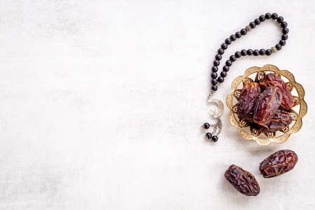 Dates fruit and rosary still life against on white background. Ramadan background greeting card. Ramadan Kareem. Traditional culture of the Middle East.