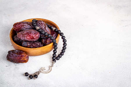 Food Ramadan dry dates or kurma with Quran and rosary. Month fasting culture Muslim and prayer for god, Ramadhan food symbolic eastern Arabian. Islamic concept.