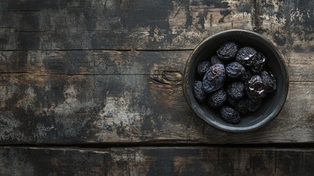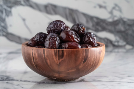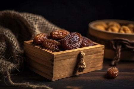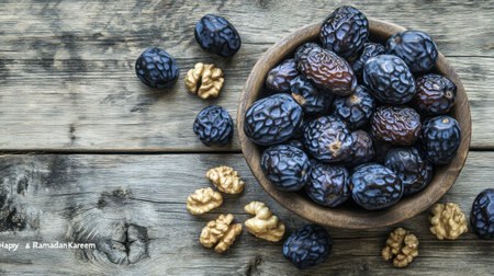 Stylish Happy Ramadan Kareem concept with dates, fruit in a bowl, and walnuts on a wooden table, close-up. Copy space for text or product banner. Stock photo contest winner, in the style of [Artist name]. --chaos 30 --ar 16:9 --v 6.1 Job ID: 4f238d87-96ef-4058-bdb2-16471e1b243e